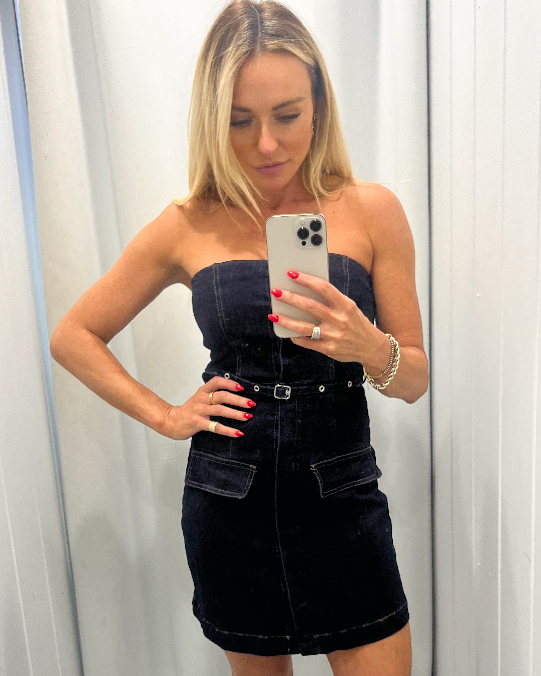 The Jasmine denim dress is designed for versatility and style.The button up detailing and strapless front offer a timeless look, while the optional matching denim tie adds a touch of personalisation. All in a beautiful dark denim fabric with contrast rust stitching.