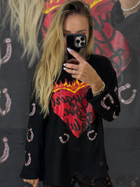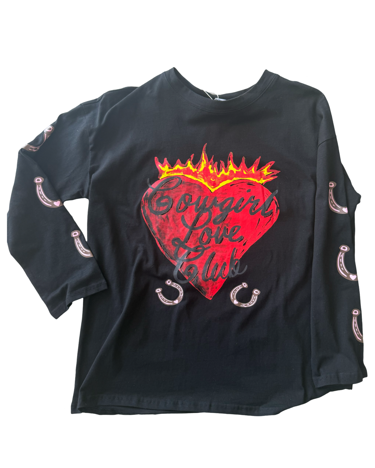 Unleash your inner cowgirl with Cowgirl Flames! Made from 100% cotton, this oversized long sleeve shirt offers a soft and comfortable feel. And with its large flaming love heat print on the front and horseshoe detail on the arm, you'll feel bold and confident as you ride through life!