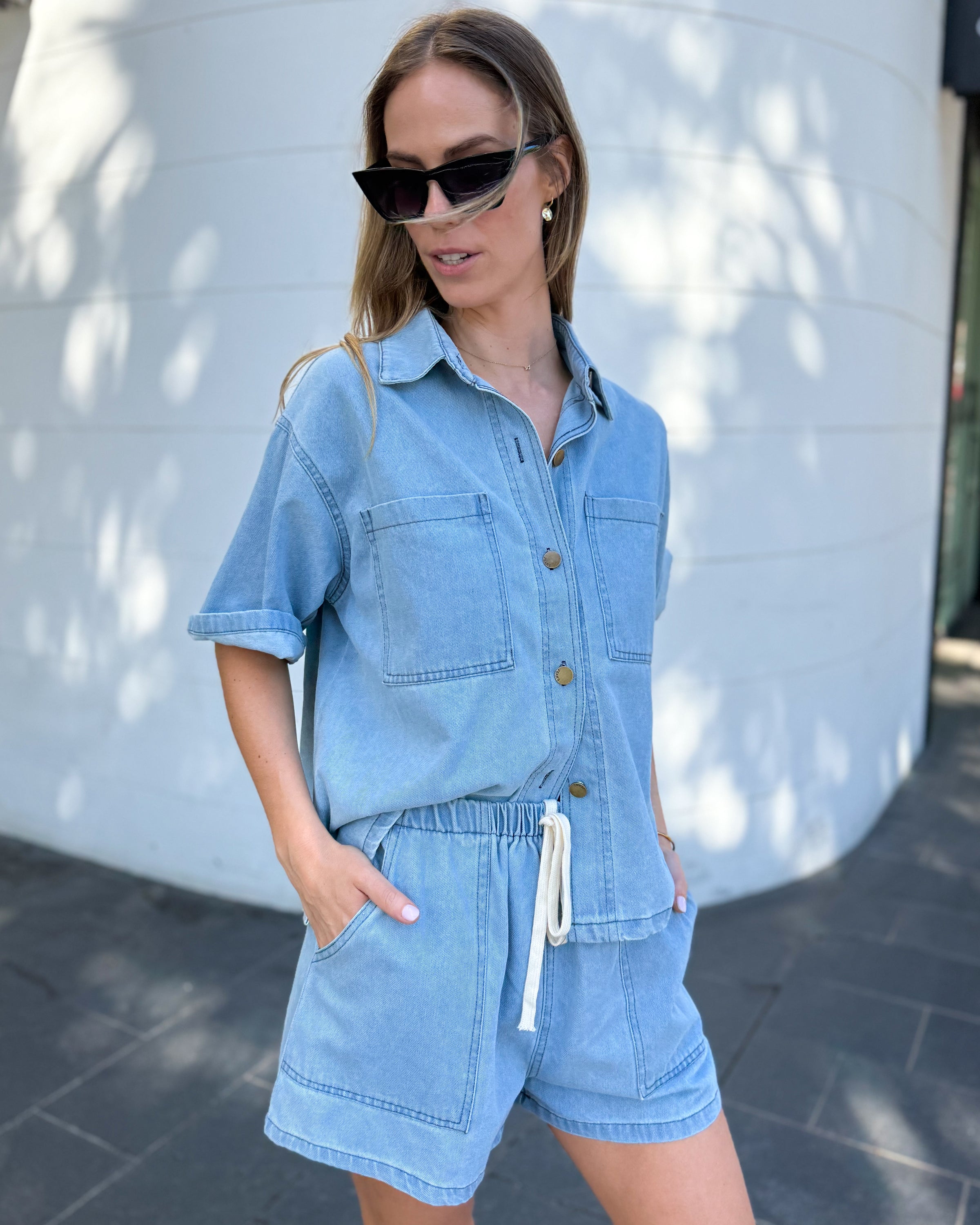 Unleash your creativity with our stylish Dallas Set! This denim set features a light blue wash that exudes effortless cool. The oversized button up shirt adds a touch of sophistication, while the elastic waist shorts with pockets provide both comfort and functionality. Perfect for any art project or casual day out!