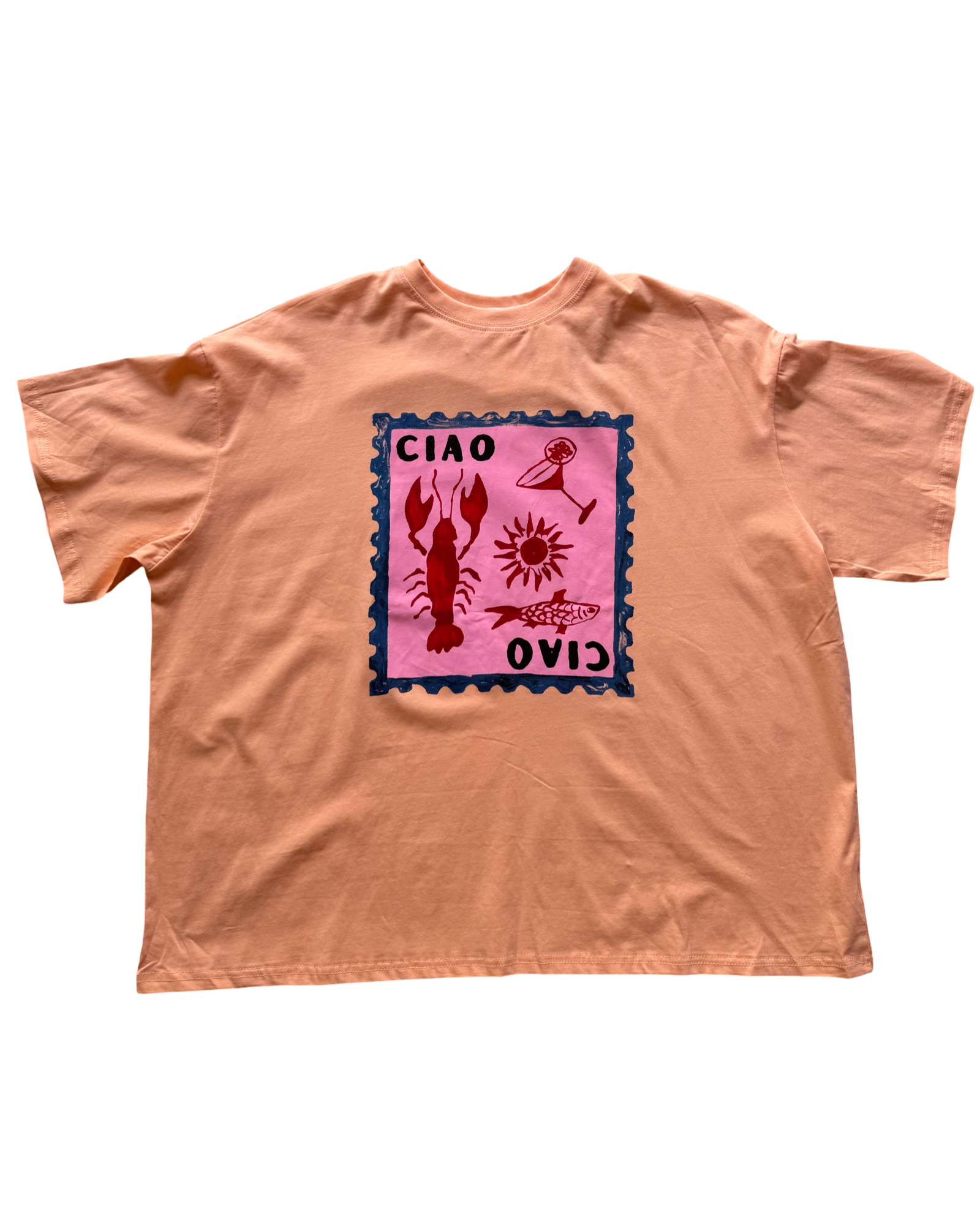 Introducing the Ciao Peach oversized tshirt! Made from 100% cotton, this tshirt boasts a soft fabric for ultimate comfort. The vibrant front print adds a pop of personality, while the plain back body keeps it simple.