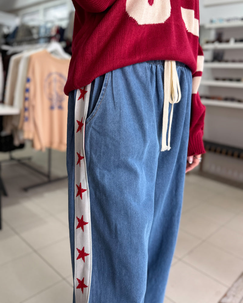 A long cotton denim pant with star print stripe on the sides, made of 100% cotton and featuring a faux drawstring waist. Pockets at side waist. Ideal for transitioning from summer to autumn. We suggest sizing down due to their oversized fit.