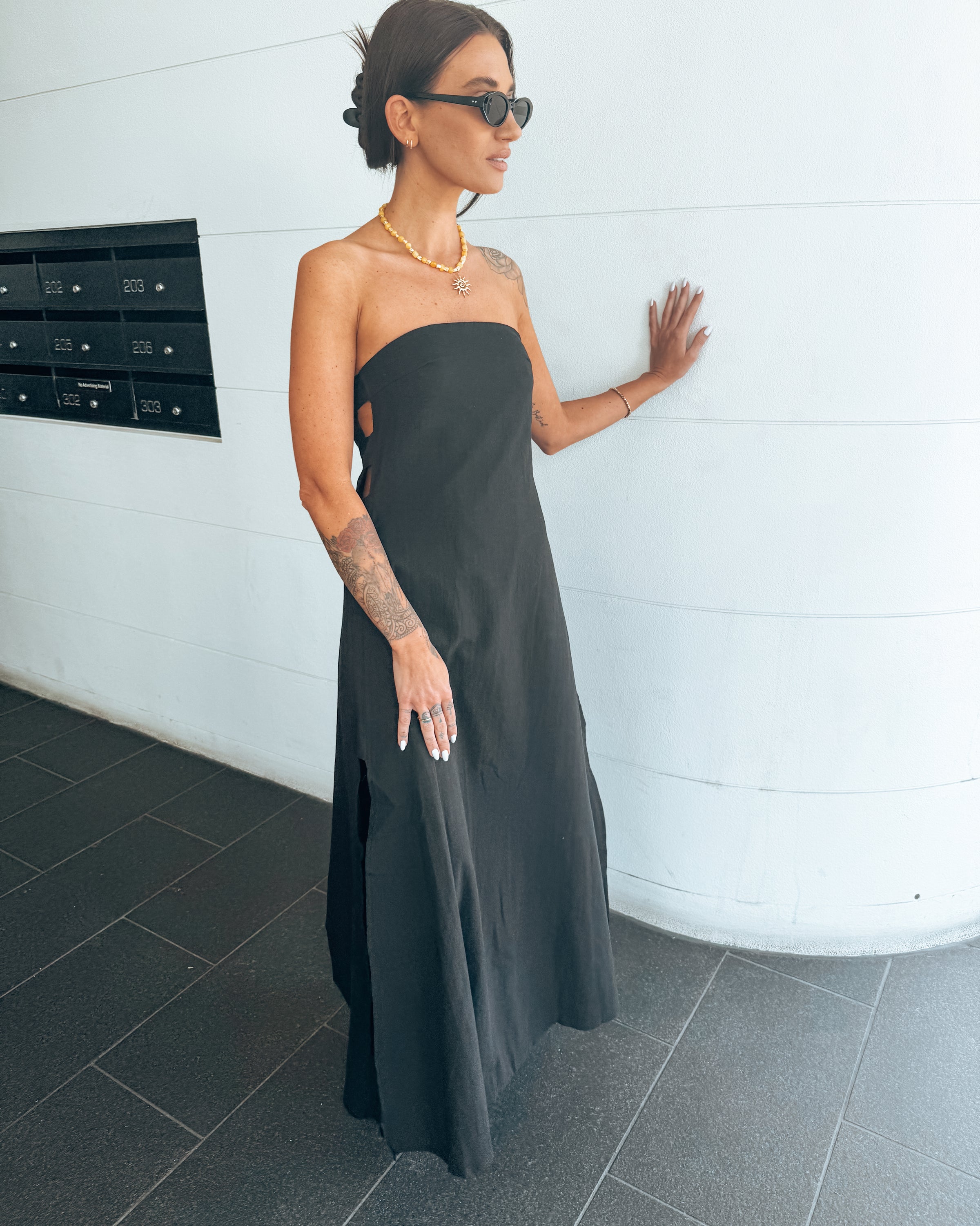 The Odessa Dress in black is a playful cotton maxi dress designed for effortless style. Fully lined with an elastic bust for a comfortable fit, it features a back zipper for easy wear. Cut-out panels at the sides add a flirty touch, making this dress perfect for warm days and special occasions alike.