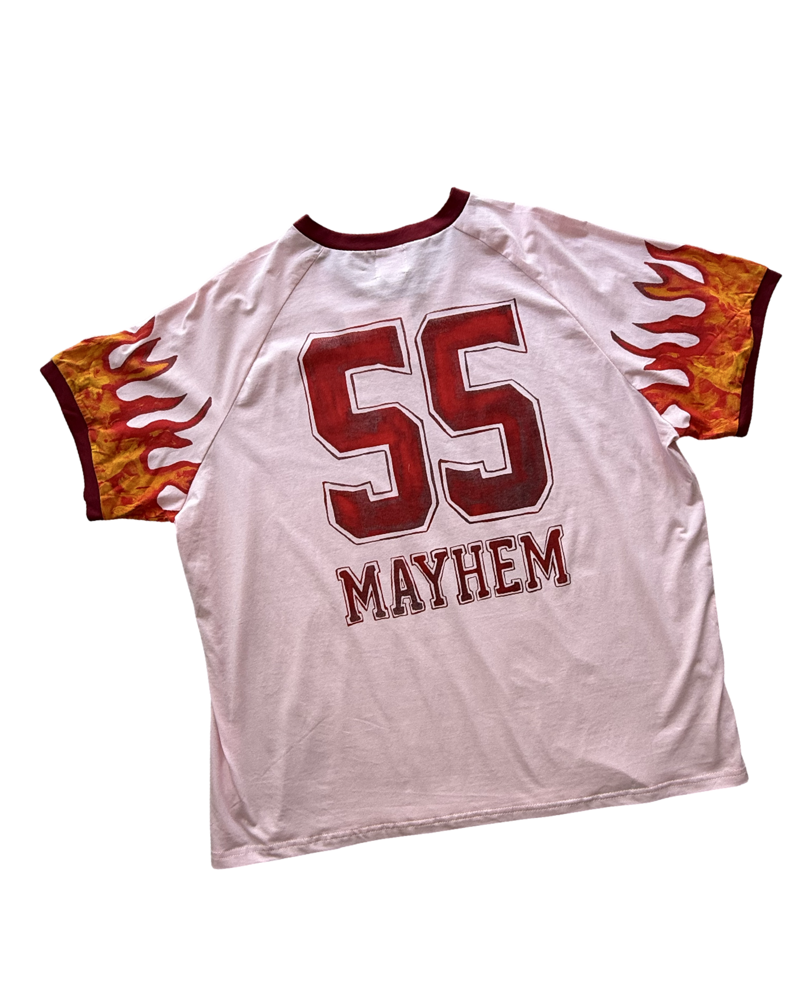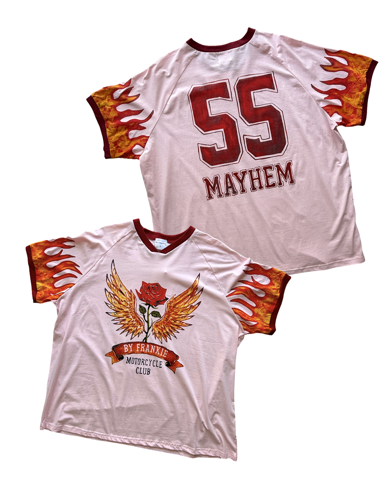 Elevate your summer wardrobe with the By Frankie Moto Tshirt, a perfect fusion of style and comfort. Expertly crafted by By Frankie in Australia, this shirt is made from 100% cotton for ultimate breathability and features a lively summer design. The back features a 55 and Mayhem motorcycle decal to complete your Moto inspired look.