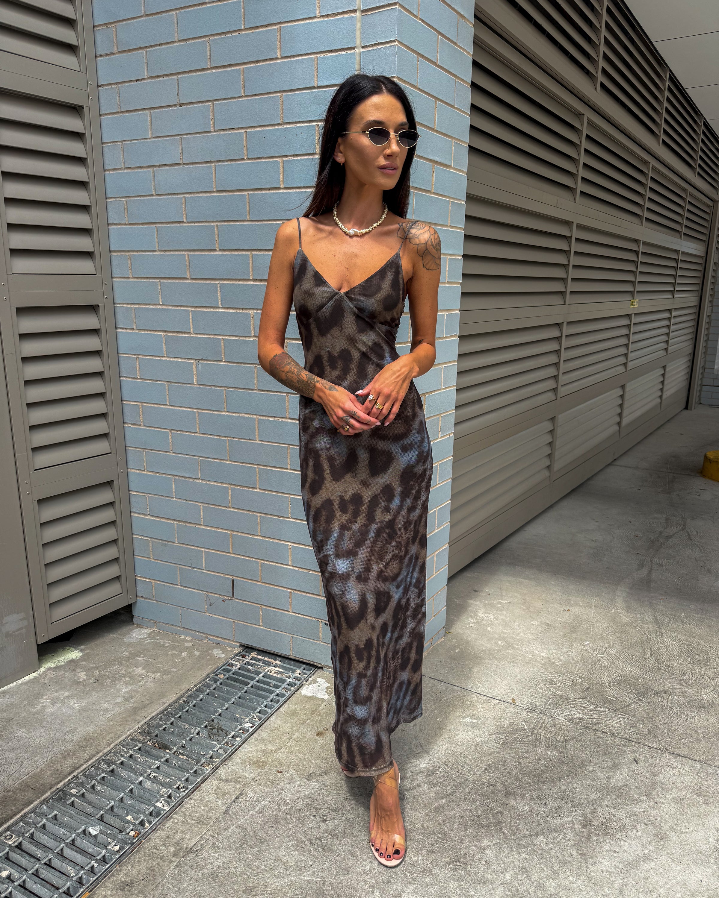 Slip into the Dusk Dress and embrace effortless elegance with a wild twist. This fully lined maxi features an eye-catching leopard-inspired print that adds just the right amount of sass to your wardrobe. The stretchy mesh fabric moves with you, while adjustable straps ensure the perfect fit every time. Whether you're heading out for an evening adventure or a casual day out, this dress delivers comfort and style in one stunning package.